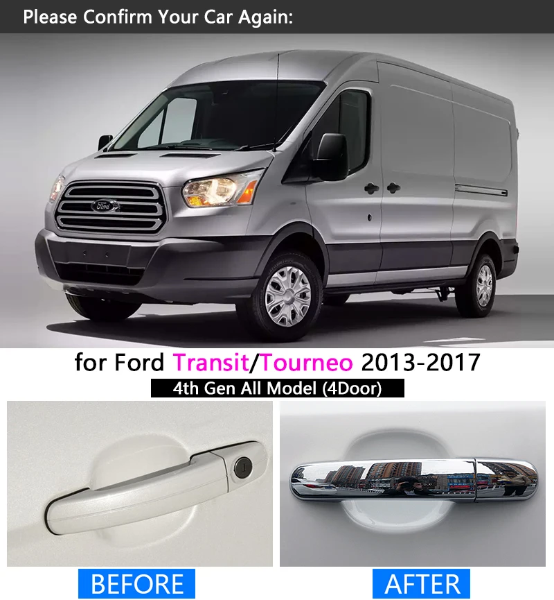 The best product you are looking for is " For Ford Transit Tourneo MK4 Chrome Handle Cover Trim Set for 4Dr 2013 2014 2015 2016 2017 Car Acce". This product is available and ready to be purchased. Get attractive discounts every time you shop in our store (aliexpress.com). Aliexpress also provides a coupon of $ 3 for the first buyer to shop there. don't forget to bookmark our store page so you can go shopping again anytime..